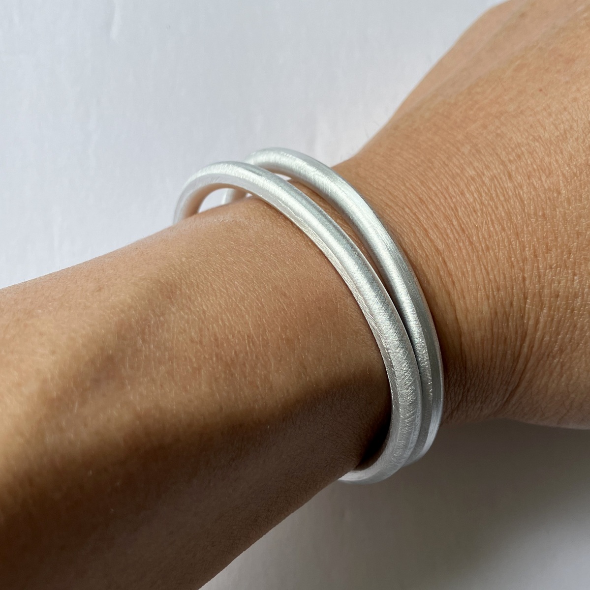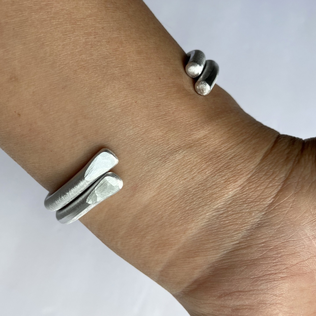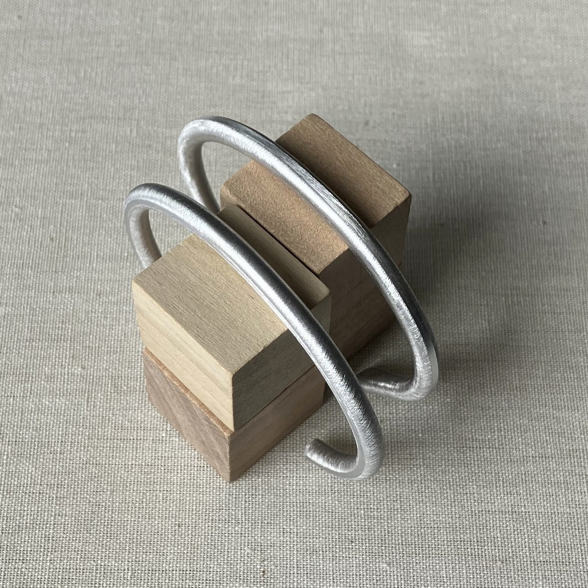 His aluminum cuff bracelets have been popular since their debut in 2023 not only because of the minimalistic style but also because of the squeezable flexibility. One end of each bracelet gets hammered to add a subtle accent.